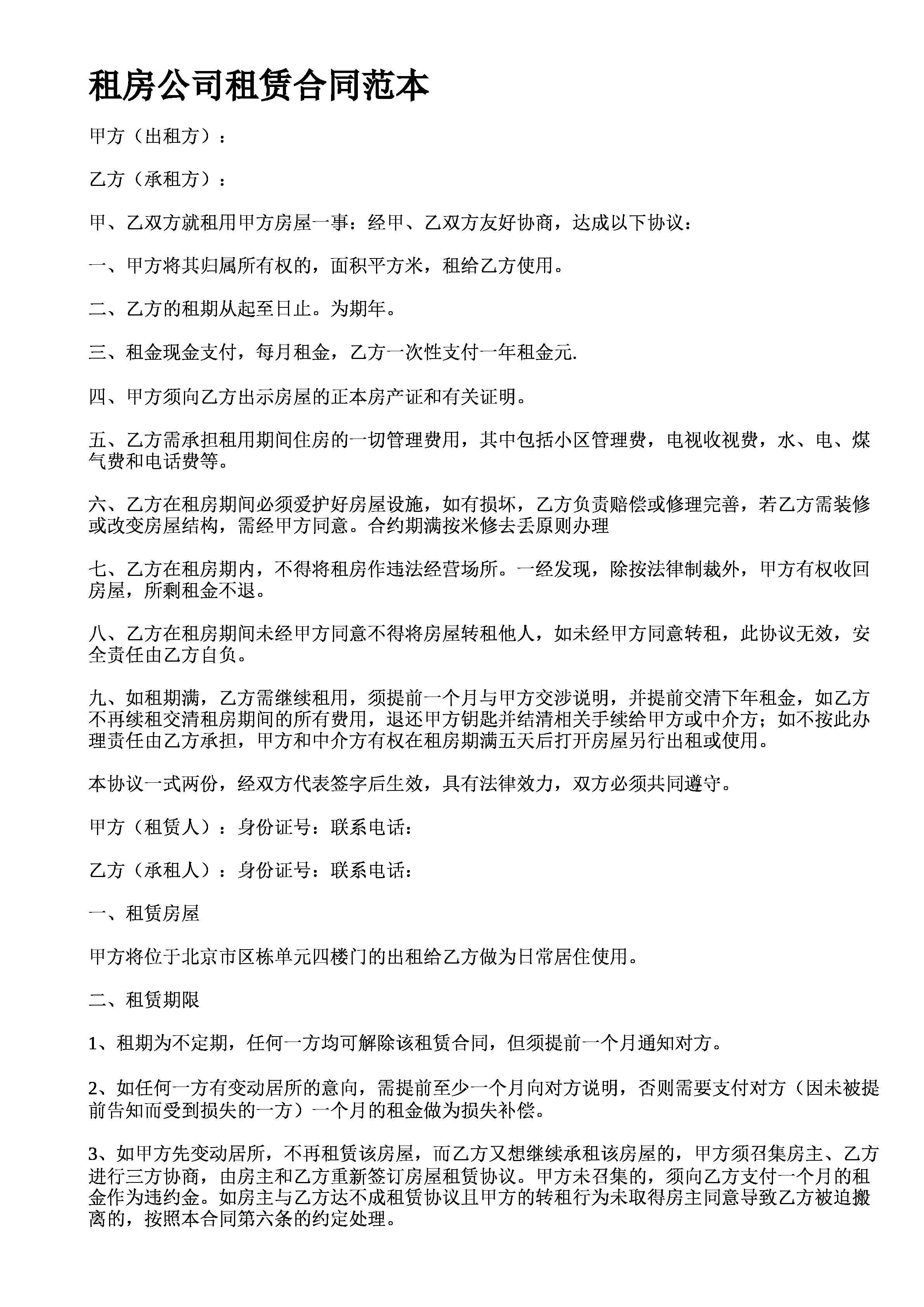 租房公司租赁合同范本甲方出租方乙方承租方甲乙双方就租用甲方房屋一事经甲乙双方友好协商达成以下协议一甲方将其归属所有权的面积平方米租给乙方使用二乙方的租期从起至日止为期年三租金现金支付每月租金乙方一次性支付一年租金元四甲方须向乙方出示房屋的正本房产证和有关证明五乙方需承担租用期间住房的一切管理费用其中包括小区管理费电视收视费水电煤气费和电话费等六乙方在租房期间必须爱护好房屋设施如有损坏乙方负责赔偿或