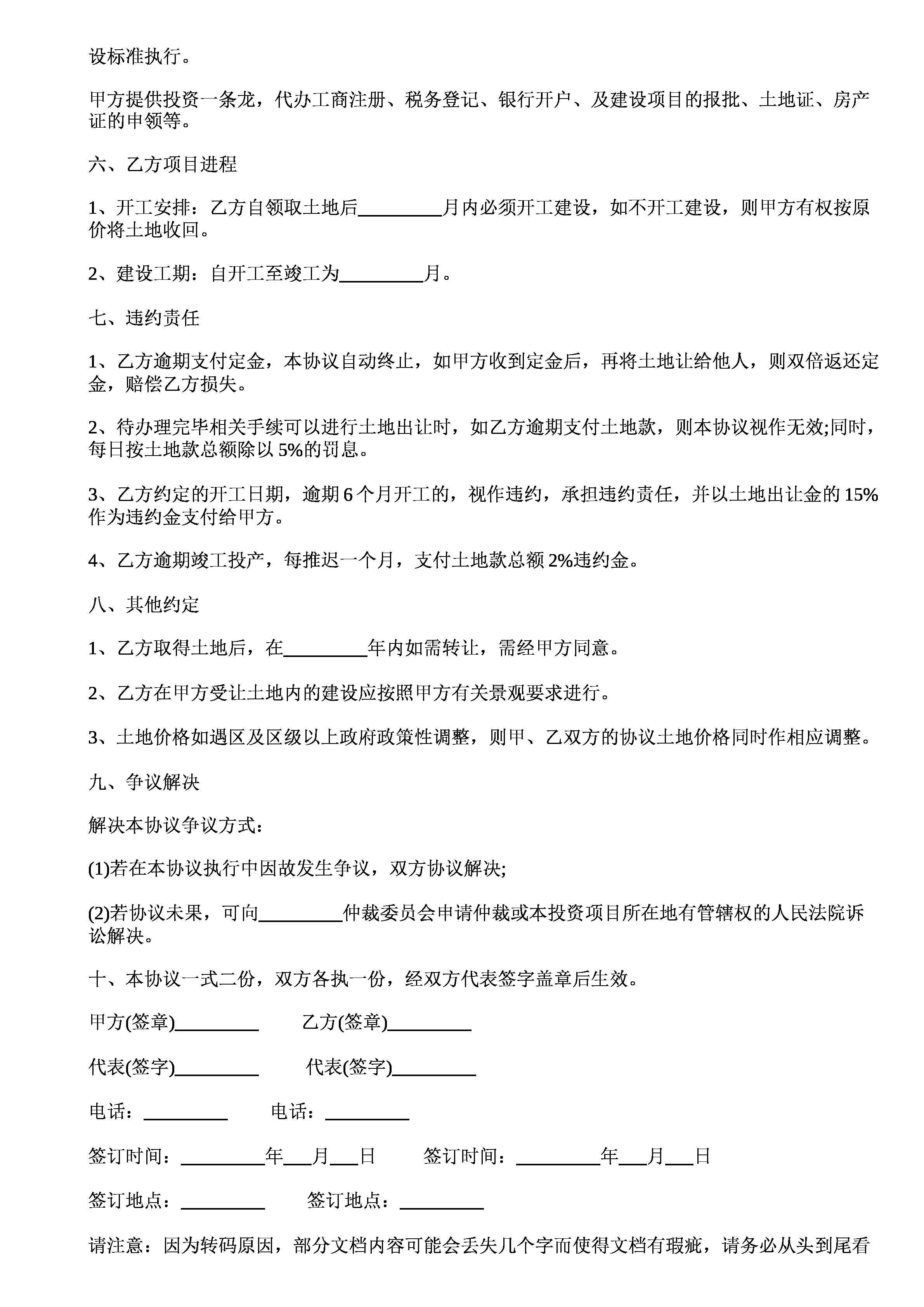 工业用地项目投资协议书样本甲方乙方公司以下简称甲方受人民政府委托和以下简称已方本着平等互利原则经过友好协商于年月日在设立项目达成以下协议一项目概况本项目兴办生产产品二项目投资规模及资金到位项目总投资万元注册资本万元资金到位安排分二期到位第一期自签约后三天到位万元第二期在做土地证前按土地评估一次性到位土地征用款城建配套款和间接用地费用万元三项目用地该土地位于地块面积约为亩具体以土管部门宗地图为准土地