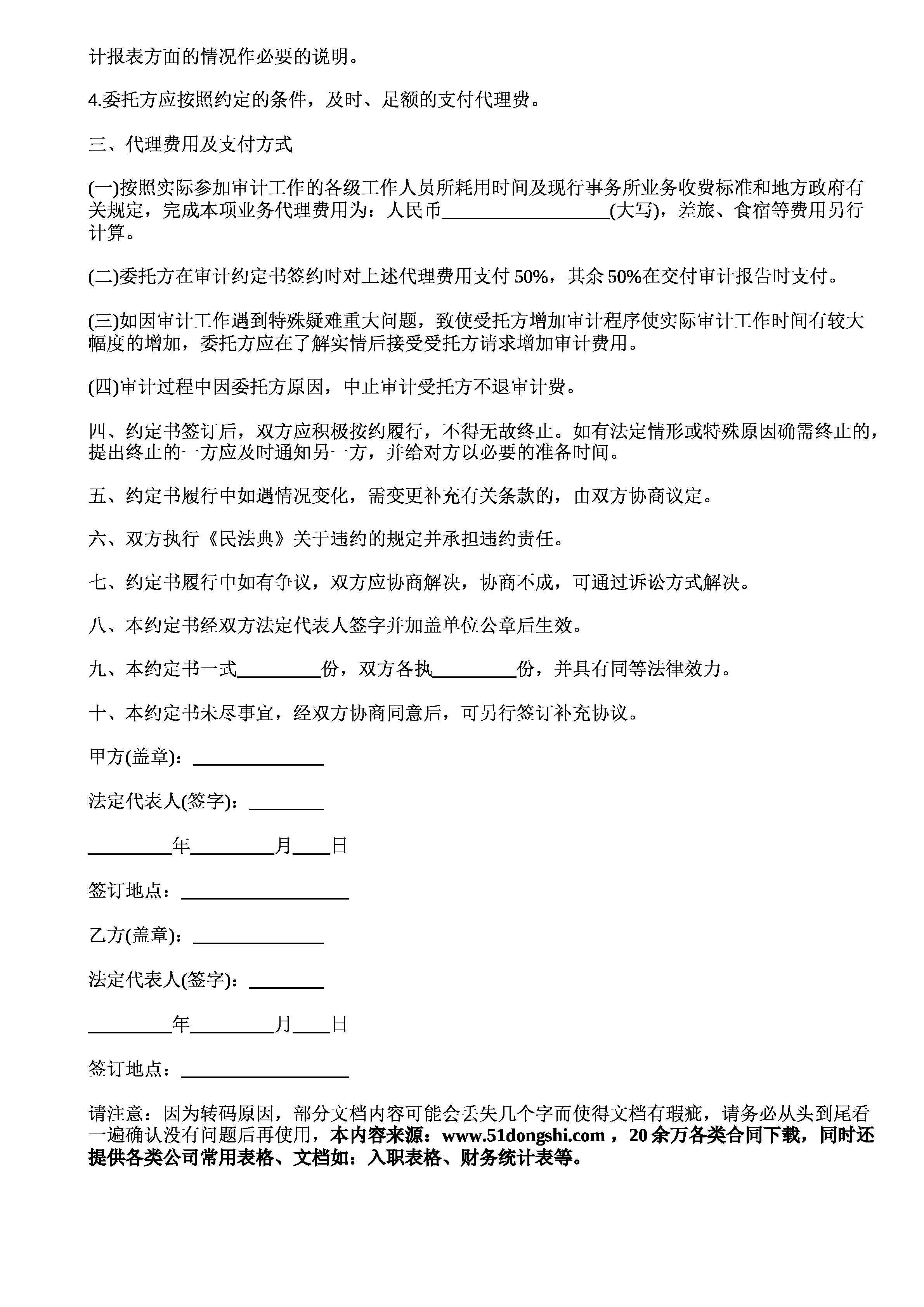 审计业务约定书模板通用版委托方法定代表人地址电话税务登记号受托方法定代表人地址电话兹有委托提供代理服务经双方协商现将双方的责任及有关事项约定如下一委托事项一项目名称二完成审核报告时间二双方的义务及责任一受托方的义务及责任受托方接受委托后应及时委派代理人员为委托方提供约定的服务按照国家有关税收法规的要求对委托方提供的企业所得税税前扣除项目相关资料实施必要的税务审核程序并按时出具审核报告受托方对在执行