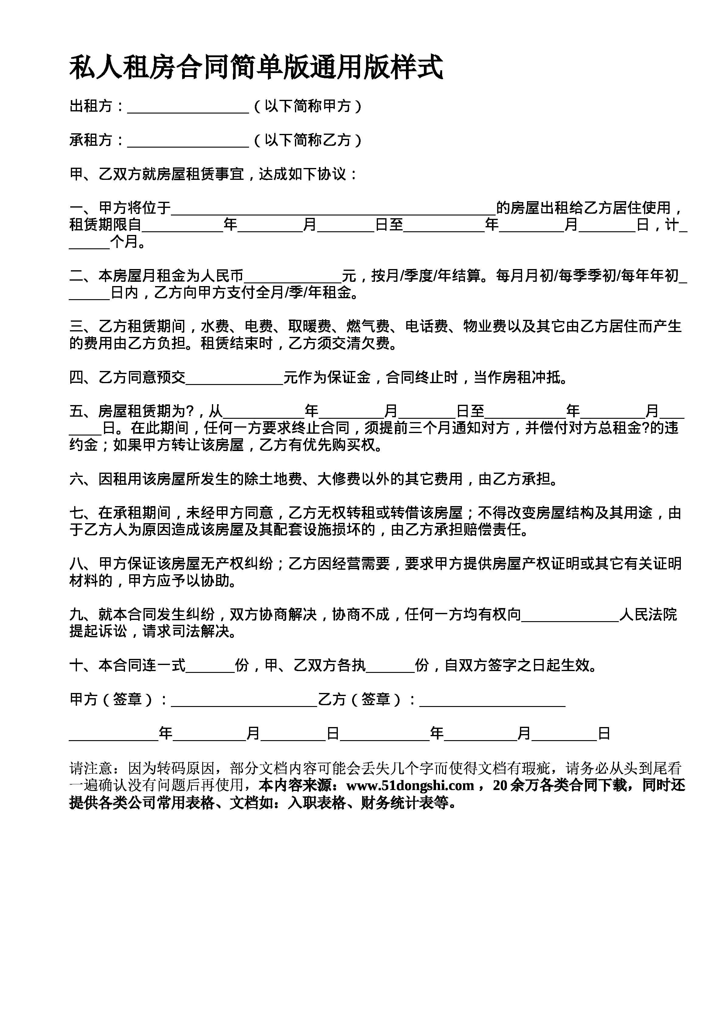 私人租房合同简单版通用版样式出租方以下简称甲方承租方以下简称乙方甲乙双方就房屋租赁事宜达成如下协议一甲方将位于的房屋出租给乙方居住使用租赁期限自年月日至年月日计个月二本房屋月租金为人民币元按月季度年结算每月月初每季季初每年年初日内乙方向甲方支付全月季年租金三乙方租赁期间水费电费取暖费燃气费电话费物业费以及其它由乙方居住而产生的费用由乙方负担租赁结束时乙方须交清欠费四乙方同意预交元作为保证金合同终止