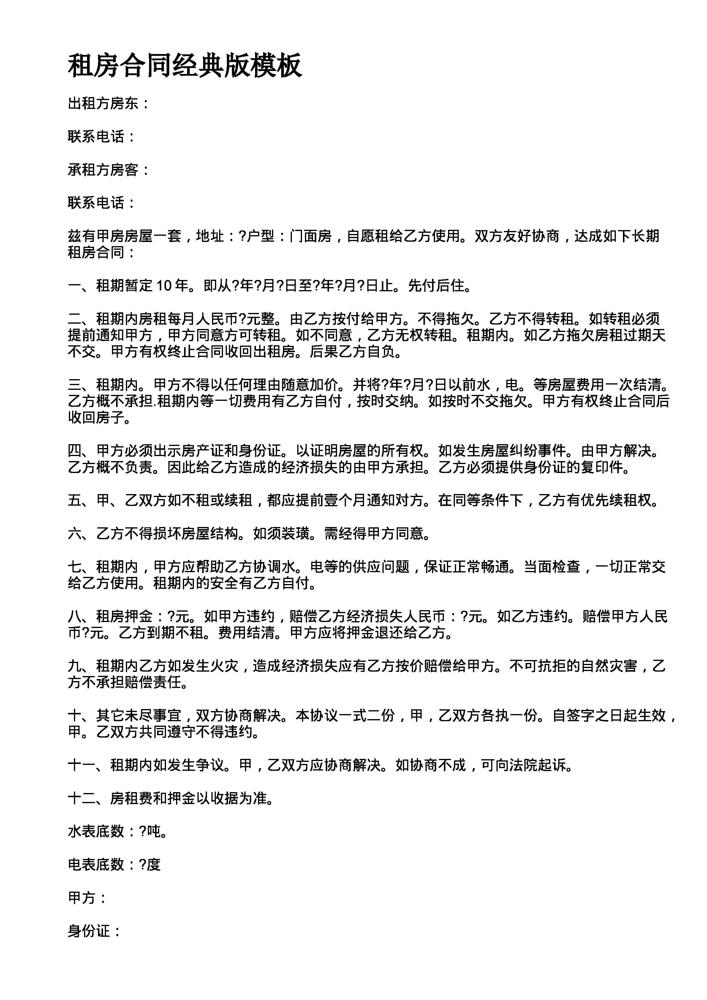 租房合同经典版模板出租方房东联系电话承租方房客联系电话兹有甲房房屋一套地址户型门面房自愿租给乙方使用双方友好协商达成如下长期租房合同一租期暂定年即从年月日至年月日止先付后住二租期内房租每月人民币元整由乙方按付给甲方不得拖欠乙方不得转租如转租必须提前通知甲方甲方同意方可转租如不同意乙方无权转租租期内如乙方拖欠房租过期天不交甲方有权终止合同收回出租房后果乙方自负三租期内甲方不得以任何理由随意加价并将年