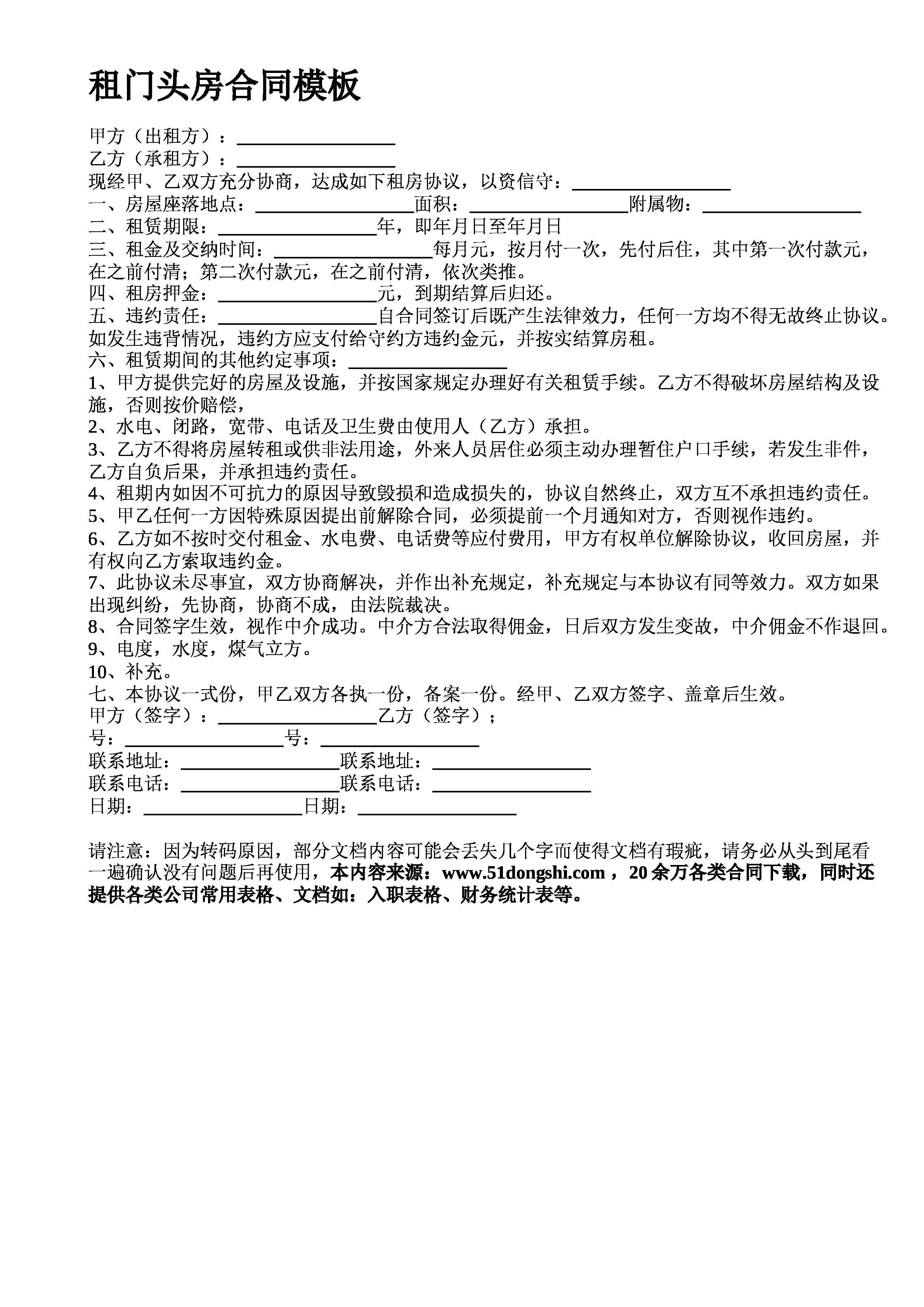 租门头房合同模板甲方出租方乙方承租方现经甲乙双方充分协商达成如下租房协议以资信守一房屋座落地点面积附属物二租赁期限年即年月日至年月日三租金及交纳时间每月元按月付一次先付后住其中第一次付款元在之前付清第二次付款元在之前付清依次类推四租房押金元到期结算后归还五违约责任自合同签订后既产生法律效力任何一方均不得无故终止协议如发生违背情况违约方应支付给守约方违约金元并按实结算房租六租赁期间的其他约定事项甲方