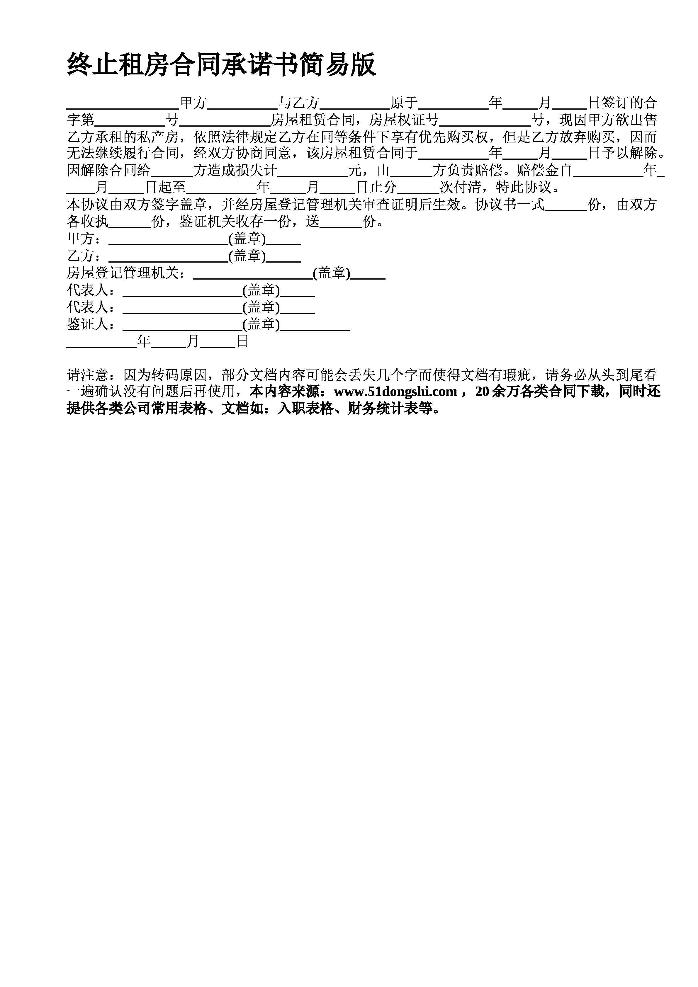 终止租房合同承诺书简易版甲方与乙方原于年月日签订的合字第号房屋租赁合同房屋权证号号现因甲方欲出售乙方承租的私产房依照法律规定乙方在同等条件下享有优先购买权但是乙方放弃购买因而无法继续履行合同经双方协商同意该房屋租赁合同于年月日予以解除因解除合同给方造成损失计元由方负责赔偿赔偿金自年月日起至年月日止分次付清特此协议本协议由双方签字盖章并经房屋登记管理机关审查证明后生效协议书一式份由双方各收执份鉴证机
