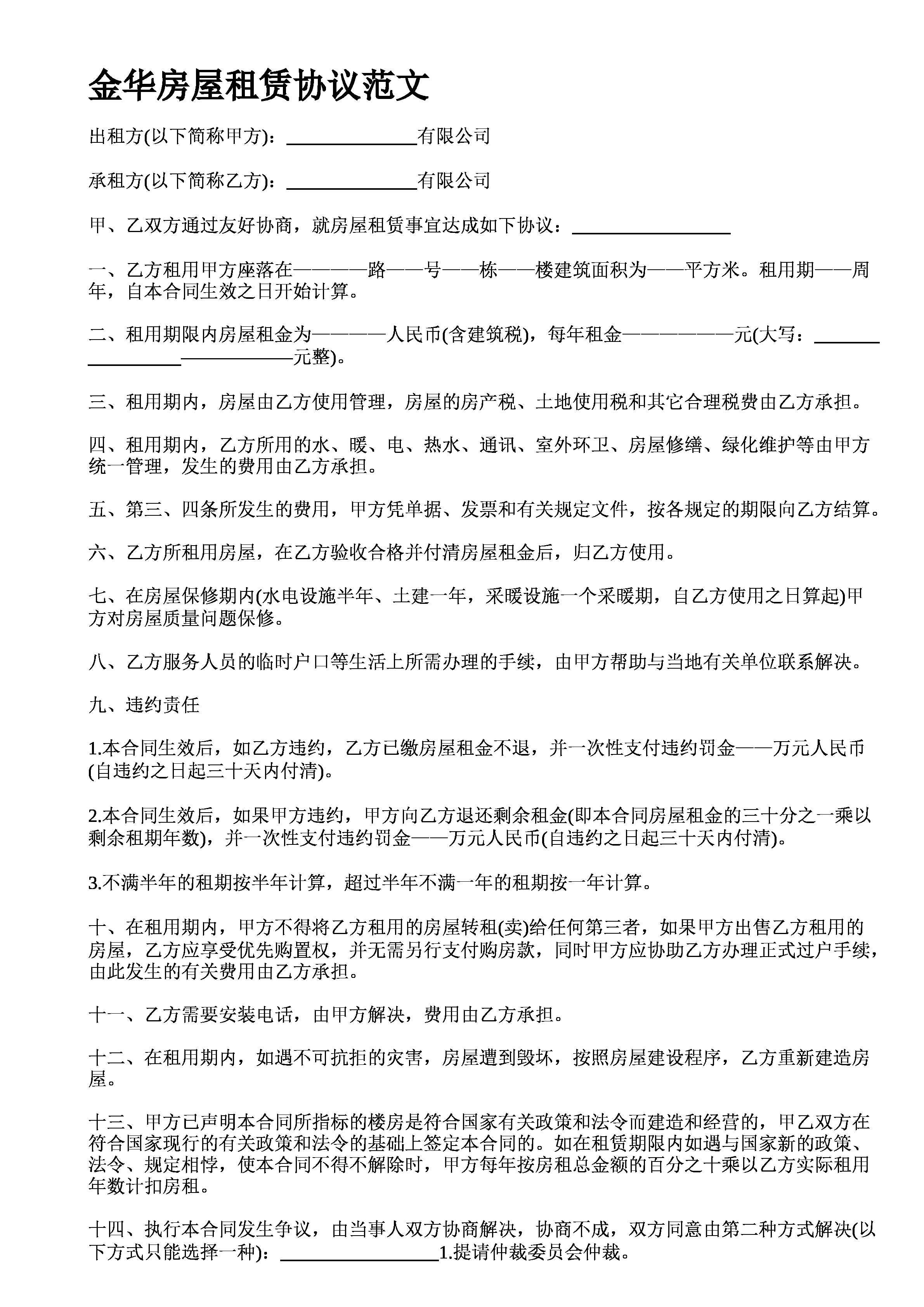 金华房屋租赁协议范文出租方以下简称甲方有限公司承租方以下简称乙方有限公司甲乙双方通过友好协商就房屋租赁事宜达成如下协议一乙方租用甲方座落在路号栋楼建筑面积为平方米租用期周年自本合同生效之日开始计算二租用期限内房屋租金为人民币含建筑税每年租金元大写元整三租用期内房屋由乙方使用管理房屋的房产税土地使用税和其它合理税费由乙方承担四租用期内乙方所用的水暖电热水通讯室外环卫房屋修缮绿化维护等由甲方统一管理发