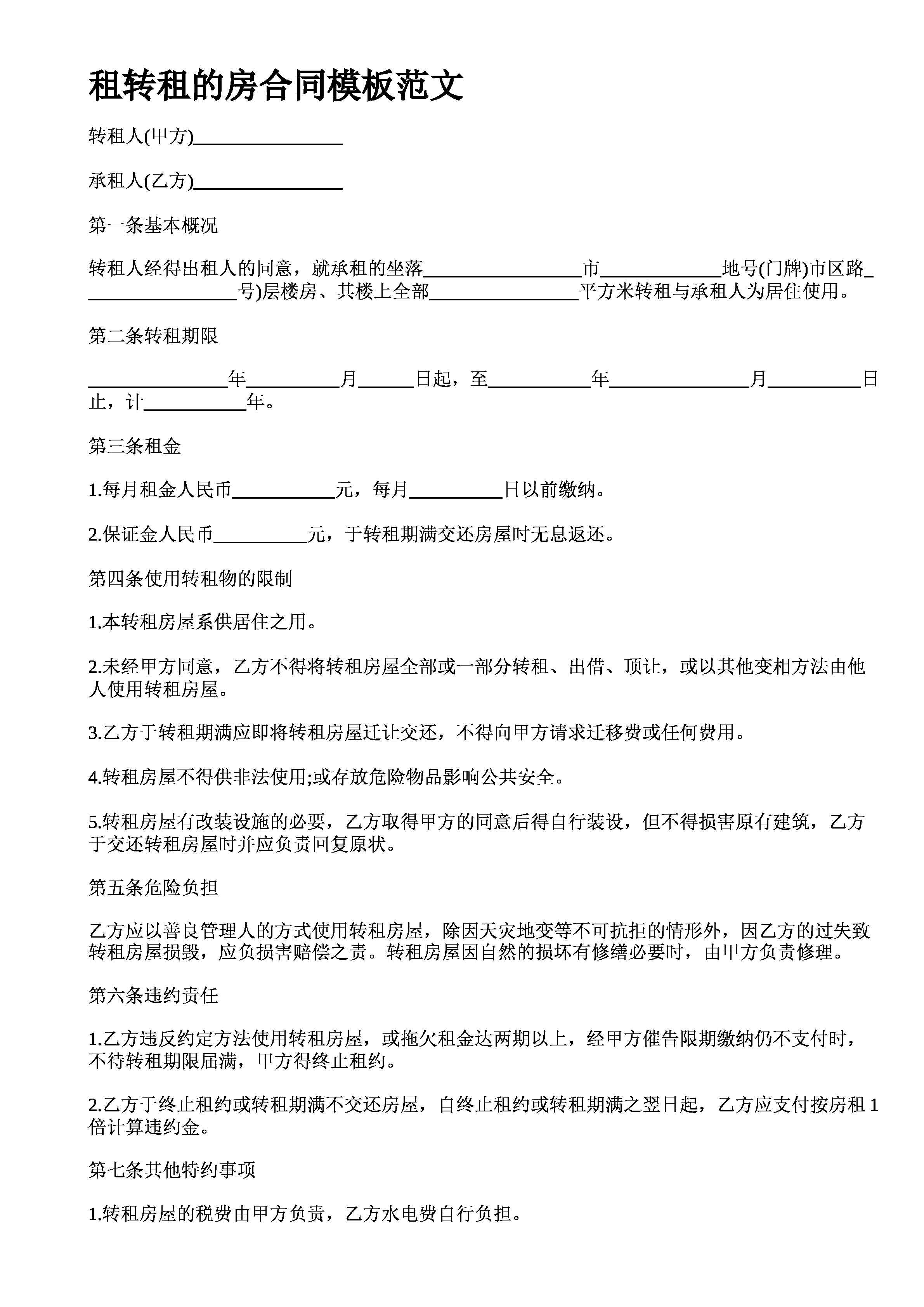 租转租的房合同模板范文转租人甲方承租人乙方第一条基本概况转租人经得出租人的同意就承租的坐落市地号门牌市区路号层楼房其楼上全部平方米转租与承租人为居住使用第二条转租期限年月日起至年月日止计年第三条租金每月租金人民币元每月日以前缴纳保证金人民币元于转租期满交还房屋时无息返还第四条使用转租物的限制本转租房屋系供居住之用未经甲方同意乙方不得将转租房屋全部或一部分转租出借顶让或以其他变相方法由他人使用转租房