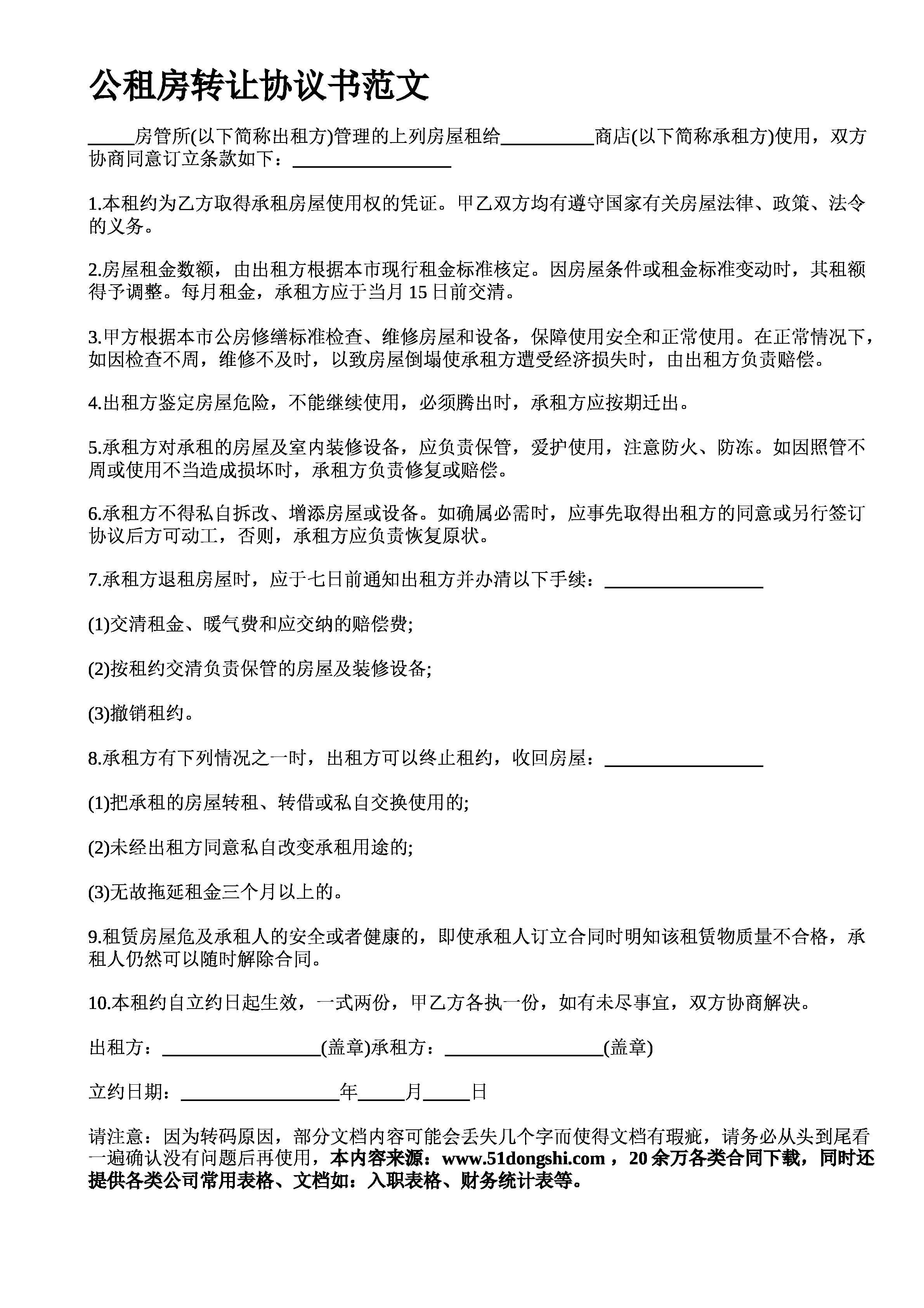 公租房转让协议书范文房管所以下简称出租方管理的上列房屋租给商店以下简称承租方使用双方协商同意订立条款如下本租约为乙方取得承租房屋使用权的凭证甲乙双方均有遵守国家有关房屋法律政策法令的义务房屋租金数额由出租方根据本市现行租金标准核定因房屋条件或租金标准变动时其租额得予调整每月租金承租方应于当月日前交清甲方根据本市公房修缮标准检查维修房屋和设备保障使用安全和正常使用在正常情况下如因检查不周维修不及时以