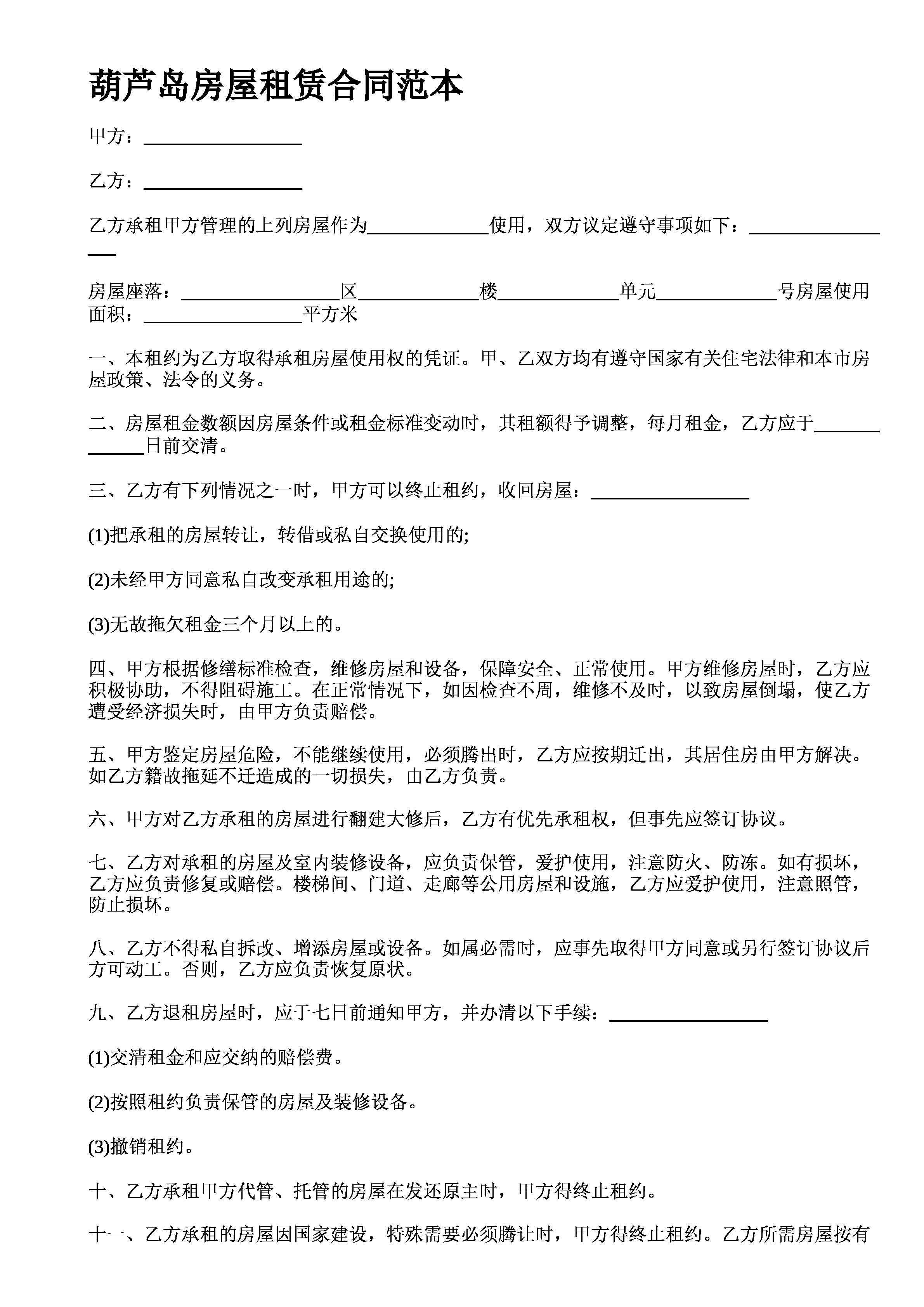 葫芦岛房屋租赁合同范本甲方乙方乙方承租甲方管理的上列房屋作为使用双方议定遵守事项如下房屋座落区楼单元号房屋使用面积平方米一本租约为乙方取得承租房屋使用权的凭证甲乙双方均有遵守国家有关住宅法律和本市房屋政策法令的义务二房屋租金数额因房屋条件或租金标准变动时其租额得予调整每月租金乙方应于日前交清三乙方有下列情况之一时甲方可以终止租约收回房屋把承租的房屋转让转借或私自交换使用的未经甲方同意私自改变承租用