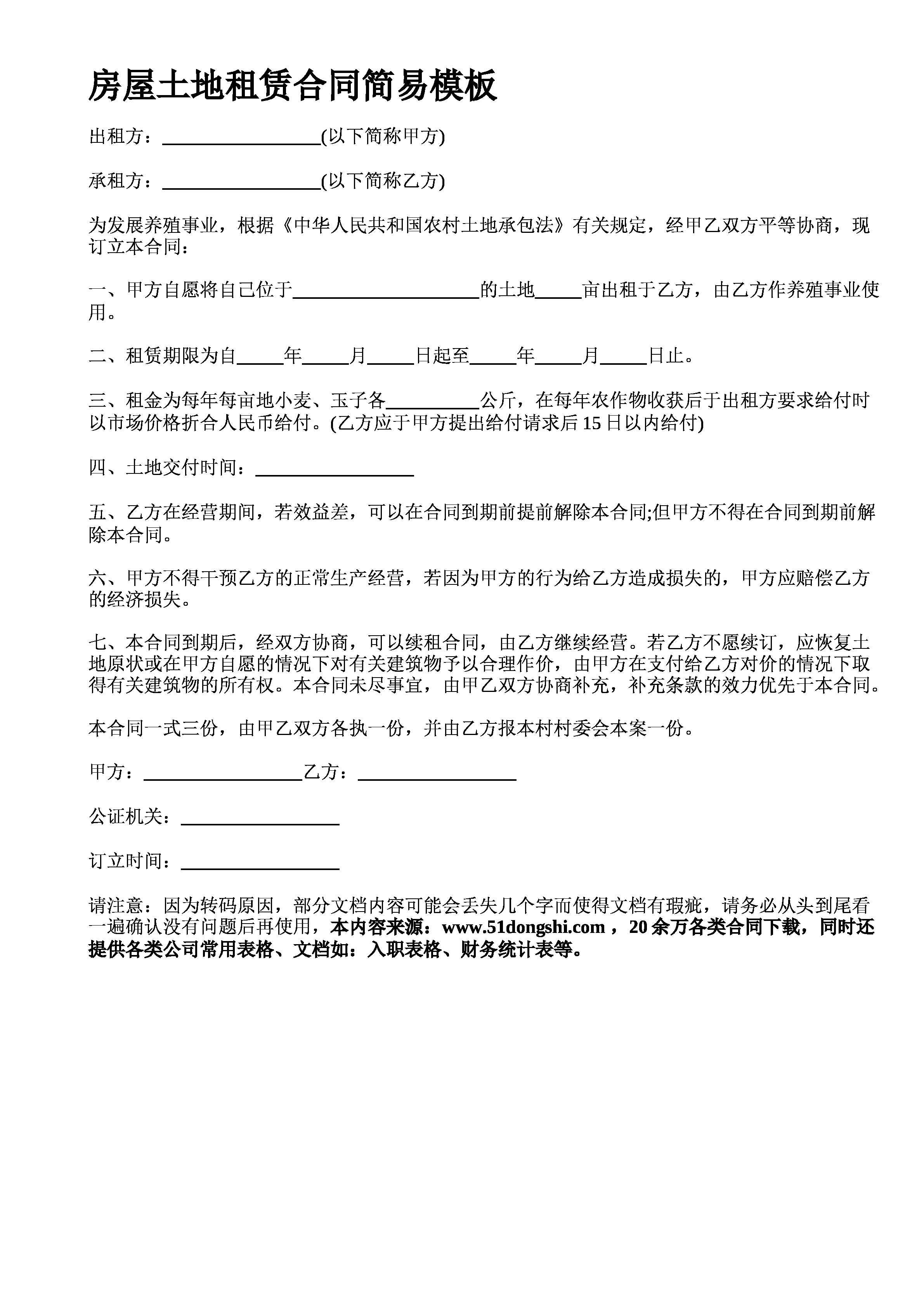 房屋土地租赁合同简易模板出租方以下简称甲方承租方以下简称乙方为发展养殖事业根据中华人民共和国农村土地承包法有关规定经甲乙双方平等协商现订立本合同一甲方自愿将自己位于的土地亩出租于乙方由乙方作养殖事业使用二租赁期限为自年月日起至年月日止三租金为每年每亩地小麦玉子各公斤在每年农作物收获后于出租方要求给付时以市场价格折合人民币给付乙方应于甲方提出给付请求后日以内给付四土地交付时间五乙方在经营期间若效益差