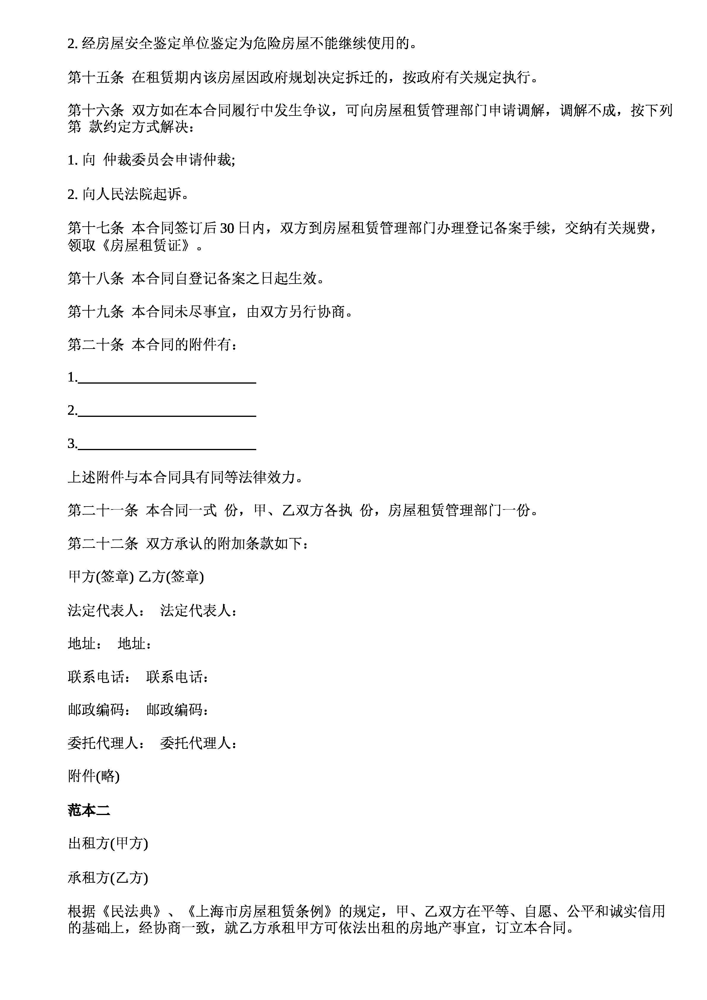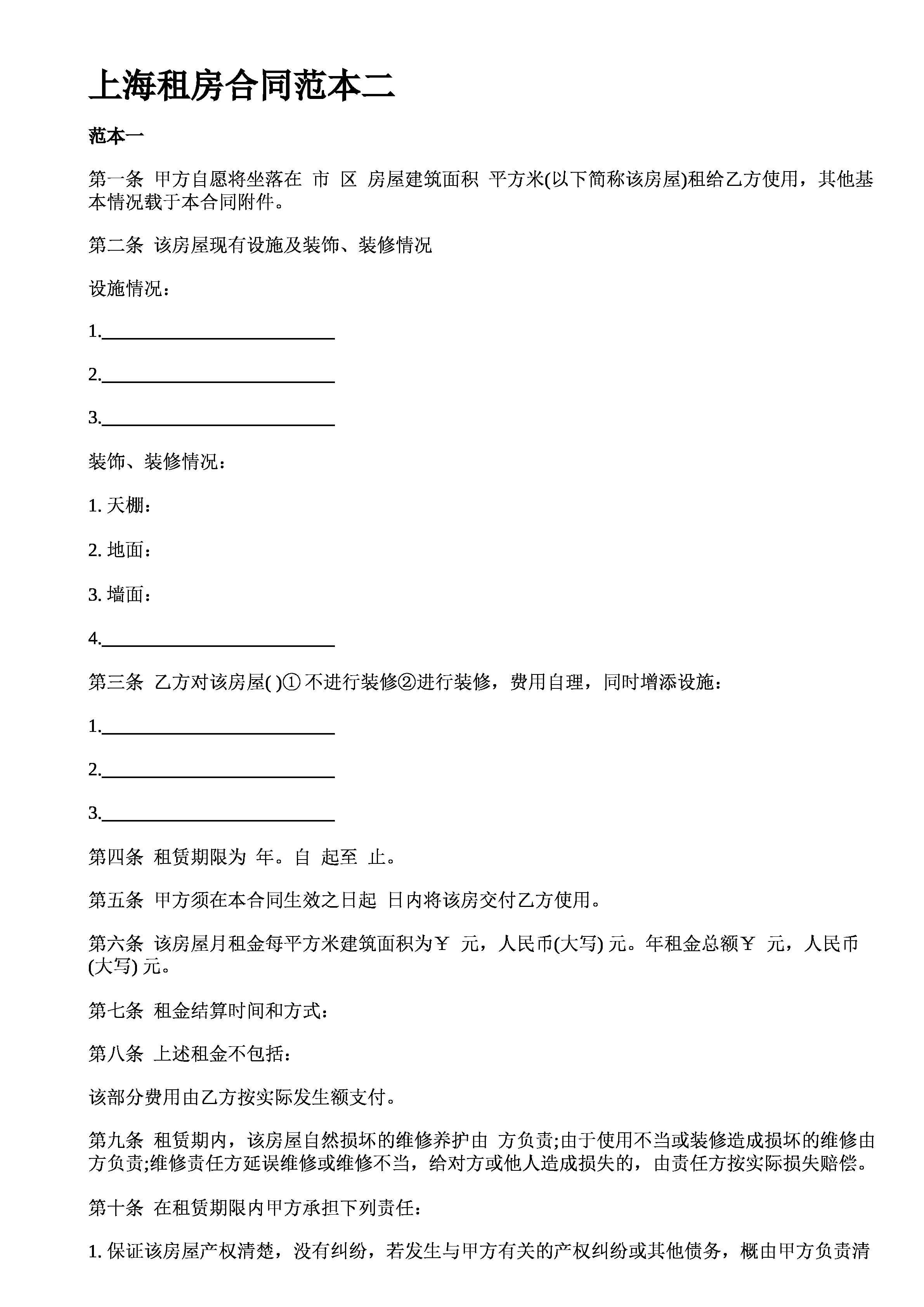 上海租房合同范本二范本一第一条甲方自愿将坐落在市区房屋建筑面积平方米以下简称该房屋租给乙方使用其他基本情况载于本合同附件第二条该房屋现有设施及装饰装修情况设施情况装饰装修情况天棚地面墙面第三条乙方对该房屋不进行装修进行装修费用自理同时增添设施第四条租赁期限为年自起至止第五条甲方须在本合同生效之日起日内将该房交付乙方使用第六条该房屋月租金每平方米建筑面积为元人民币大写元年租金总额元人民币大写元第七条