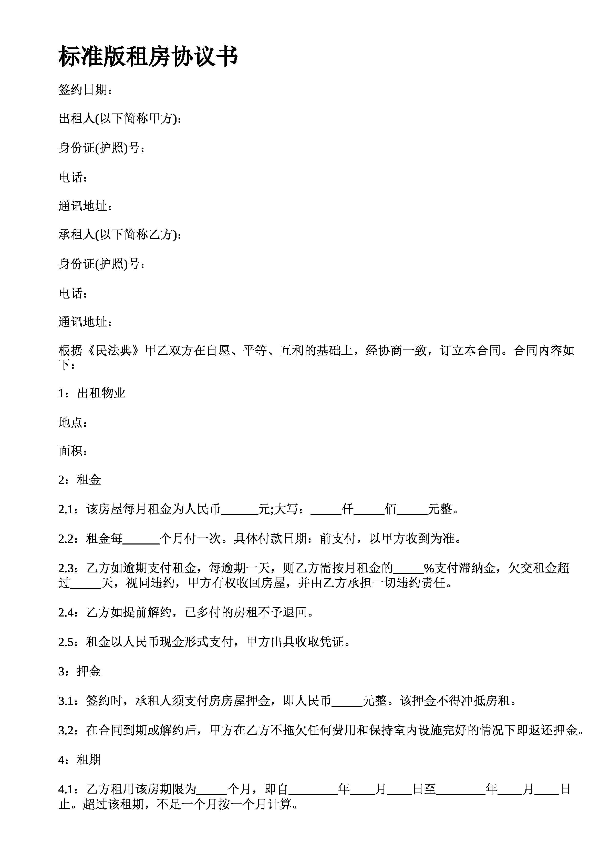 标准版租房协议书签约日期出租人以下简称甲方身份证护照号电话通讯地址承租人以下简称乙方身份证护照号电话通讯地址根据民法典甲乙双方在自愿平等互利的基础上经协商一致订立本合同合同内容如下出租物业地点面积租金该房屋每月租金为人民币元大写仟佰元整租金每个月付一次具体付款日期前支付以甲方收到为准乙方如逾期支付租金每逾期一天则乙方需按月租金的支付滞纳金欠交租金超过天视同违约甲方有权收回房屋并由乙方承担一切违约责