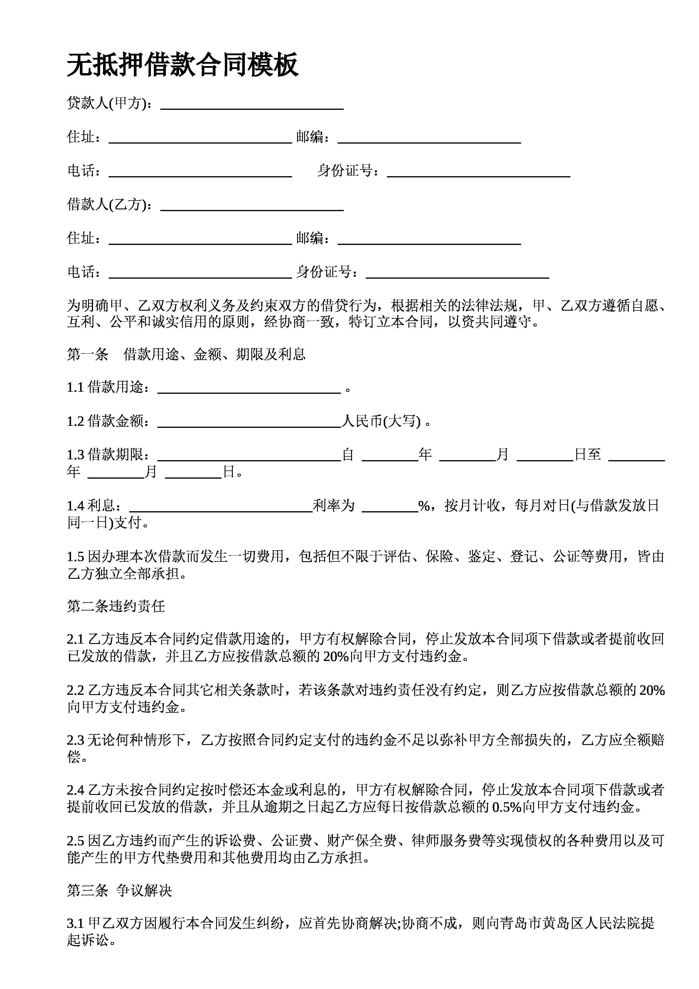 无抵押借款合同模板贷款人甲方住址邮编电话身份证号借款人乙方住址邮编电话身份证号为明确甲乙双方权利义务及约束双方的借贷行为根据相关的法律法规甲乙双方遵循自愿互利公平和诚实信用的原则经协商一致特订立本合同以资共同遵守第一条借款用途金额期限及利息借款用途借款金额人民币大写借款期限自年月日至年月日利息利率为按月计收每月对日与借款发放日同一日支付因办理本次借款而发生一切费用包括但不限于评估保险鉴定登记公证等