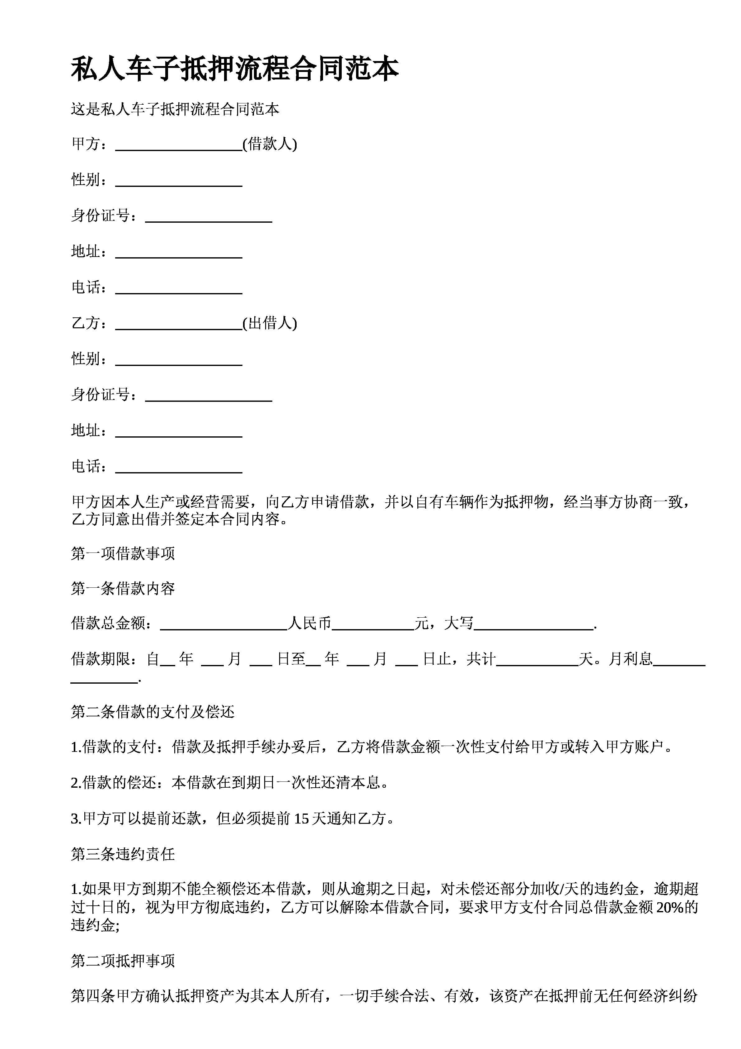 私人车子抵押流程合同范本这是私人车子抵押流程合同范本甲方借款人性别身份证号地址电话乙方出借人性别身份证号地址电话甲方因本人生产或经营需要向乙方申请借款并以自有车辆作为抵押物经当事方协商一致乙方同意出借并签定本合同内容第一项借款事项第一条借款内容借款总金额人民币元大写借款期限自年月日至年月日止共计天月利息第二条借款的支付及偿还借款的支付借款及抵押手续办妥后乙方将借款金额一次性支付给甲方或转入甲方账户
